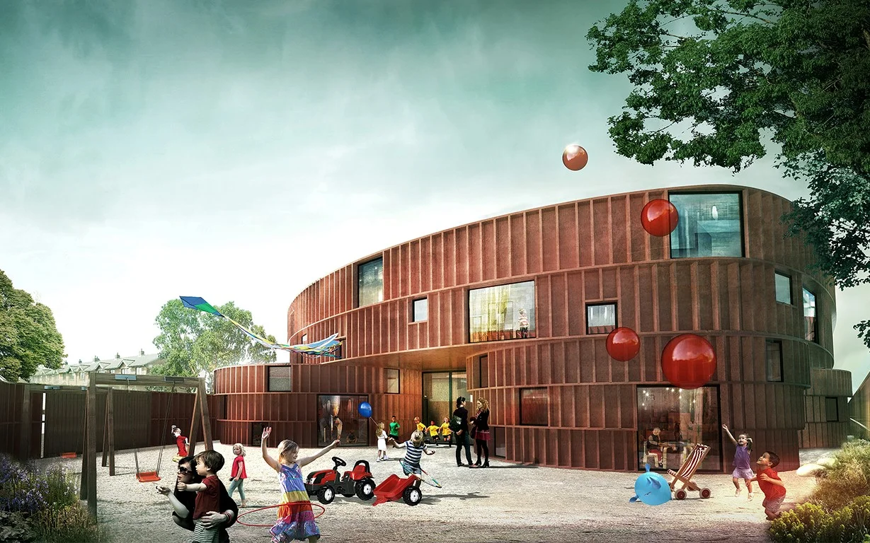The roof playground is designed with a full storey (3 meter) high parapet all around, punctuated with carefully placed windows serving as windscreens, while allowing for a future extension to the creche to be inserted without altering the elevations or appearance of the building. The building and the site boundary wall are finished with red terracotta concrete panels to maintain a visual and architectural dialogue with the surrounding red-brick buildings.