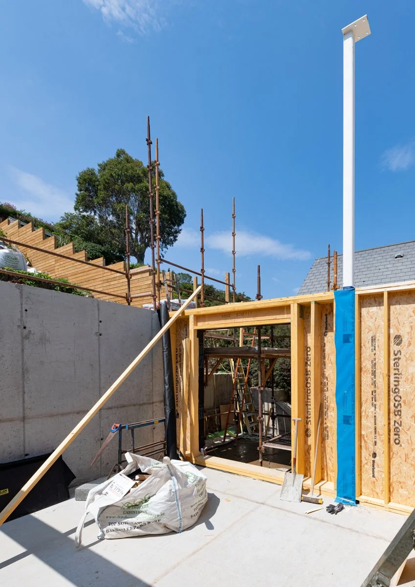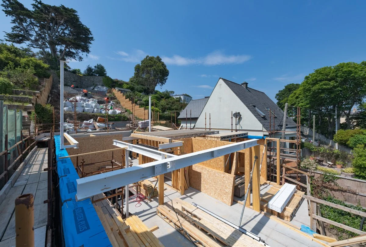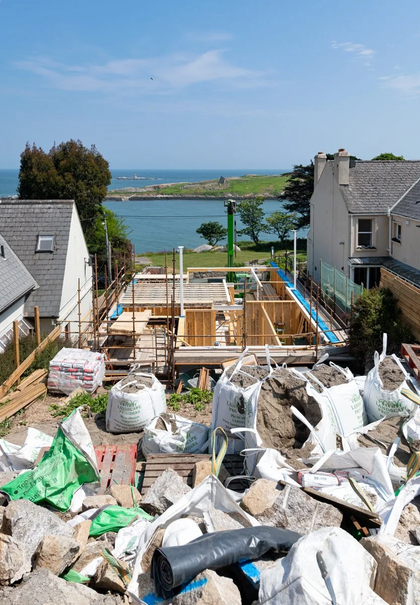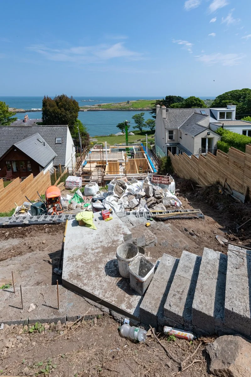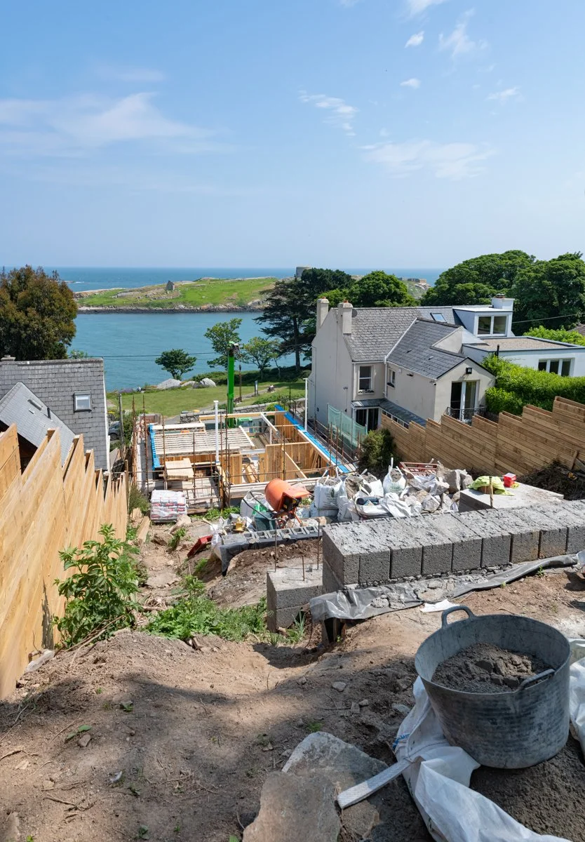 After significant site preparation and groundworks it is great to see our latest domestic project in Dalkey beginning to take shape. The aptly named Bella Vista, overlooking Dalkey Island, is designed by Miles Sampson Architects and is located on a narrow, steeply sloping site between two existing houses.