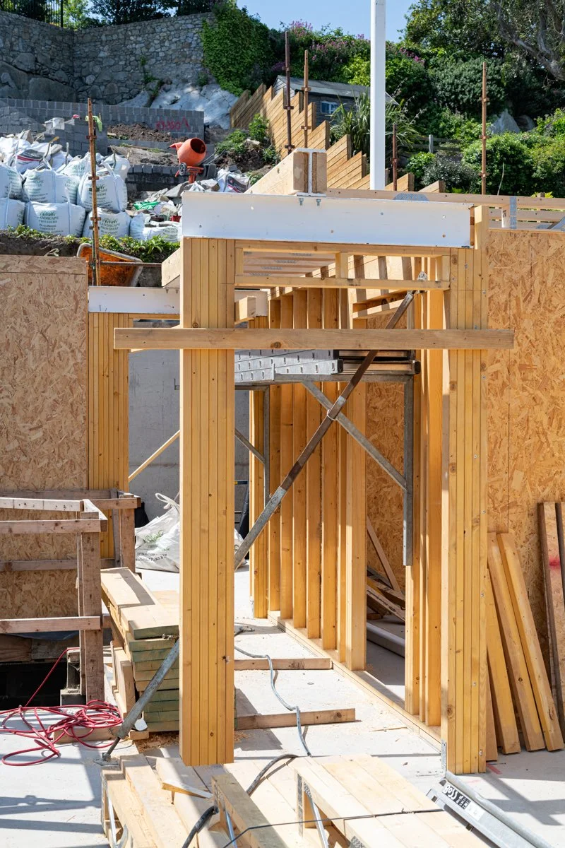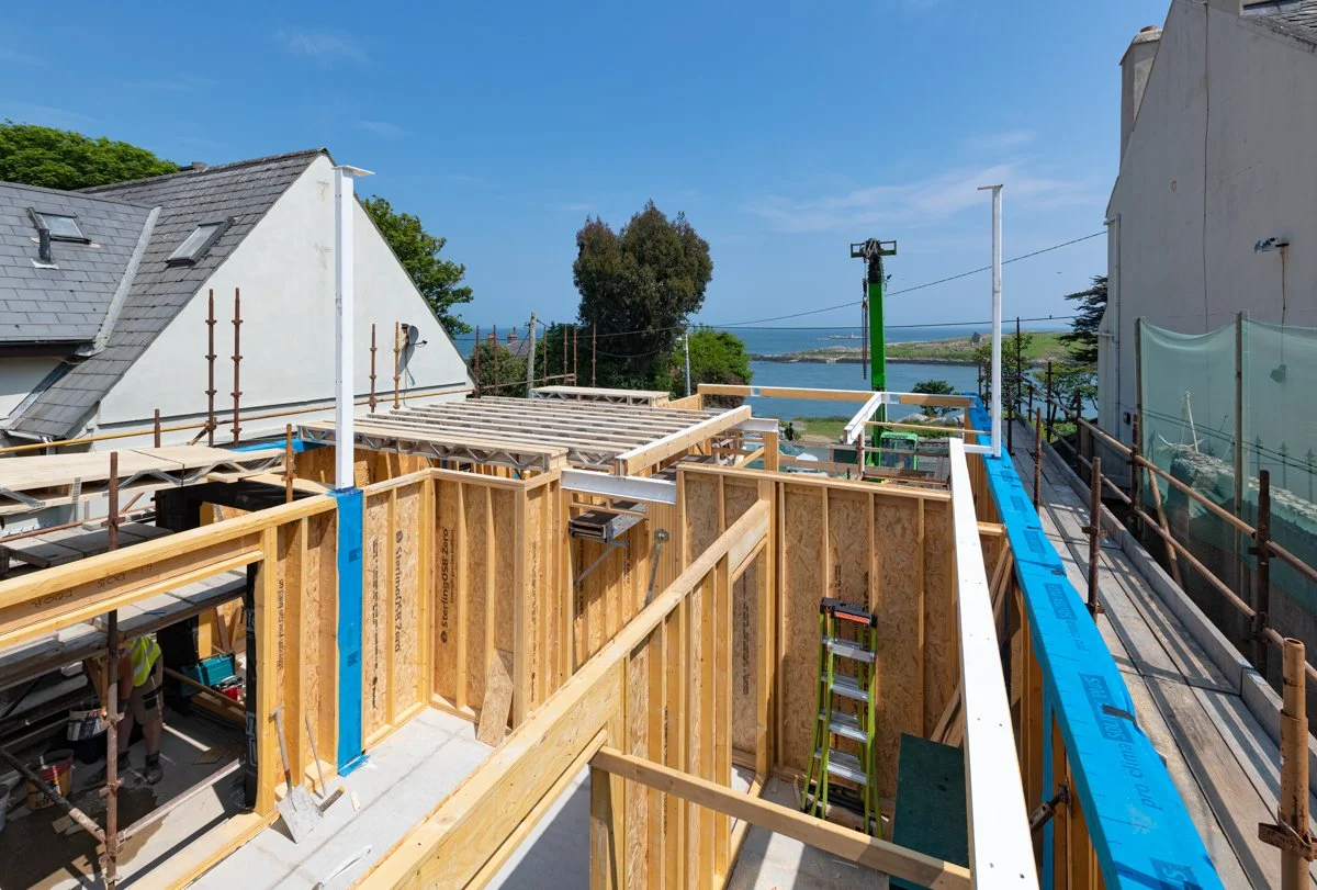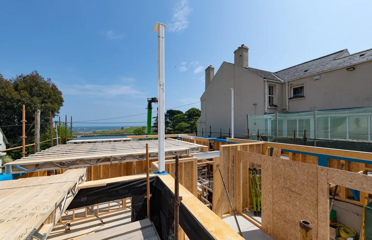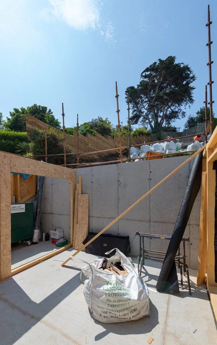 After significant site preparation and groundworks it is great to see our latest domestic project in Dalkey beginning to take shape. The aptly named Bella Vista, overlooking Dalkey Island, is designed by Miles Sampson Architects and is located on a narrow, steeply sloping site between two existing houses.