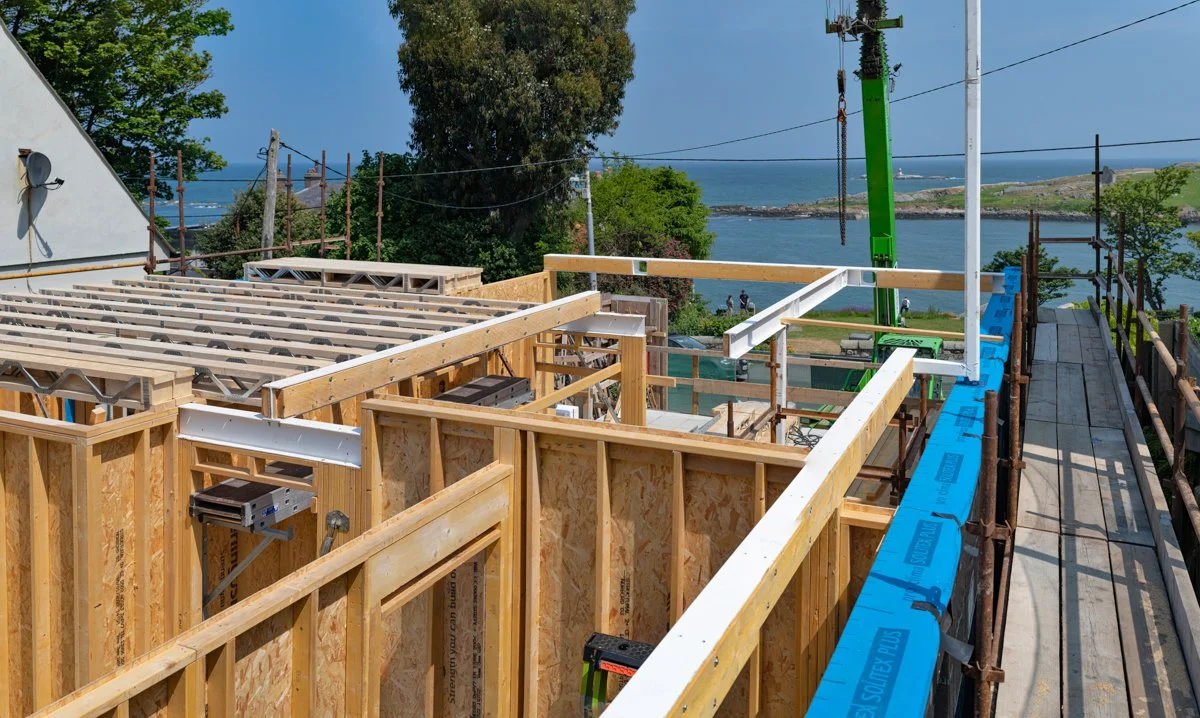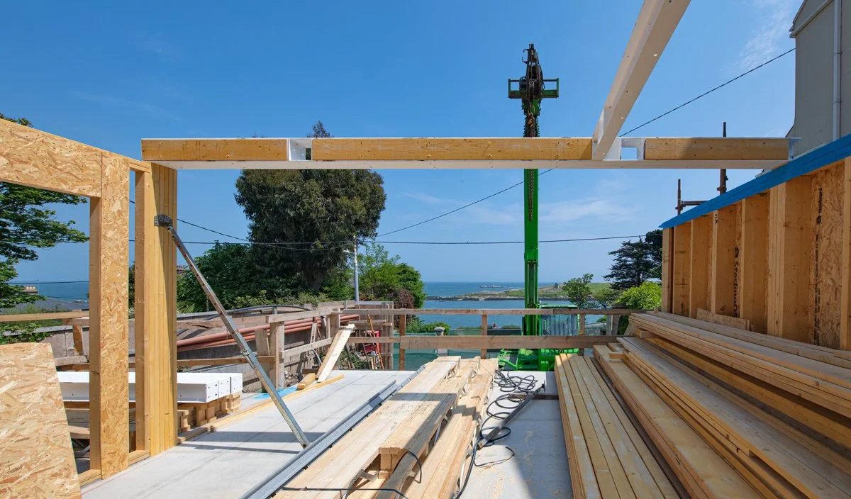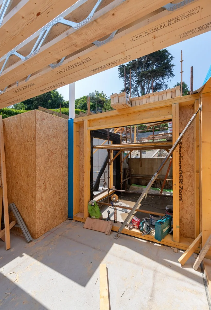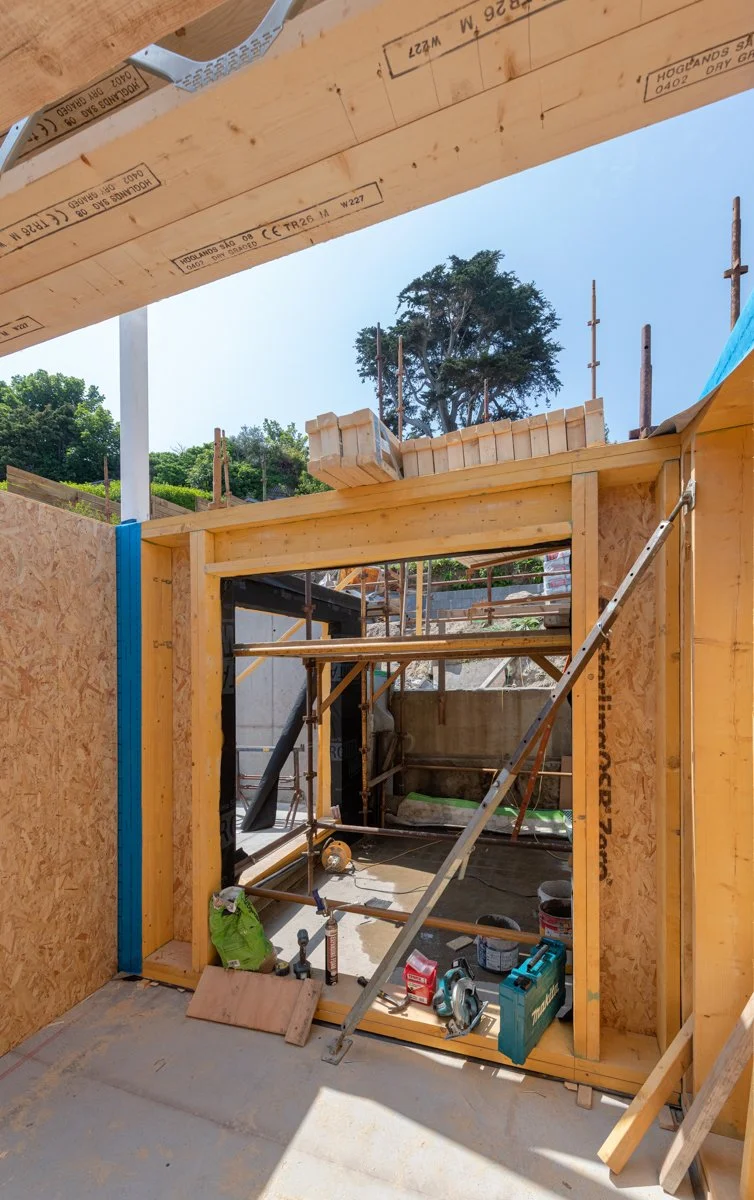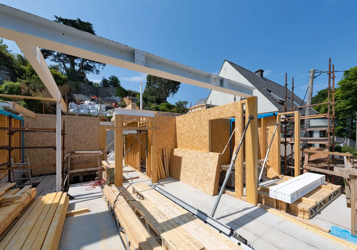 After significant site preparation and groundworks it is great to see our latest domestic project in Dalkey beginning to take shape. The aptly named Bella Vista, overlooking Dalkey Island, is designed by Miles Sampson Architects and is located on a narrow, steeply sloping site between two existing houses.